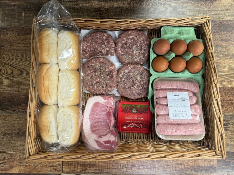 BBQ Hamper (£24.99): 6 white rolls, 4 local beef burgers, pack of thick local bacon, Welsh cheese, 6 Welsh eggs, 6 local sausages